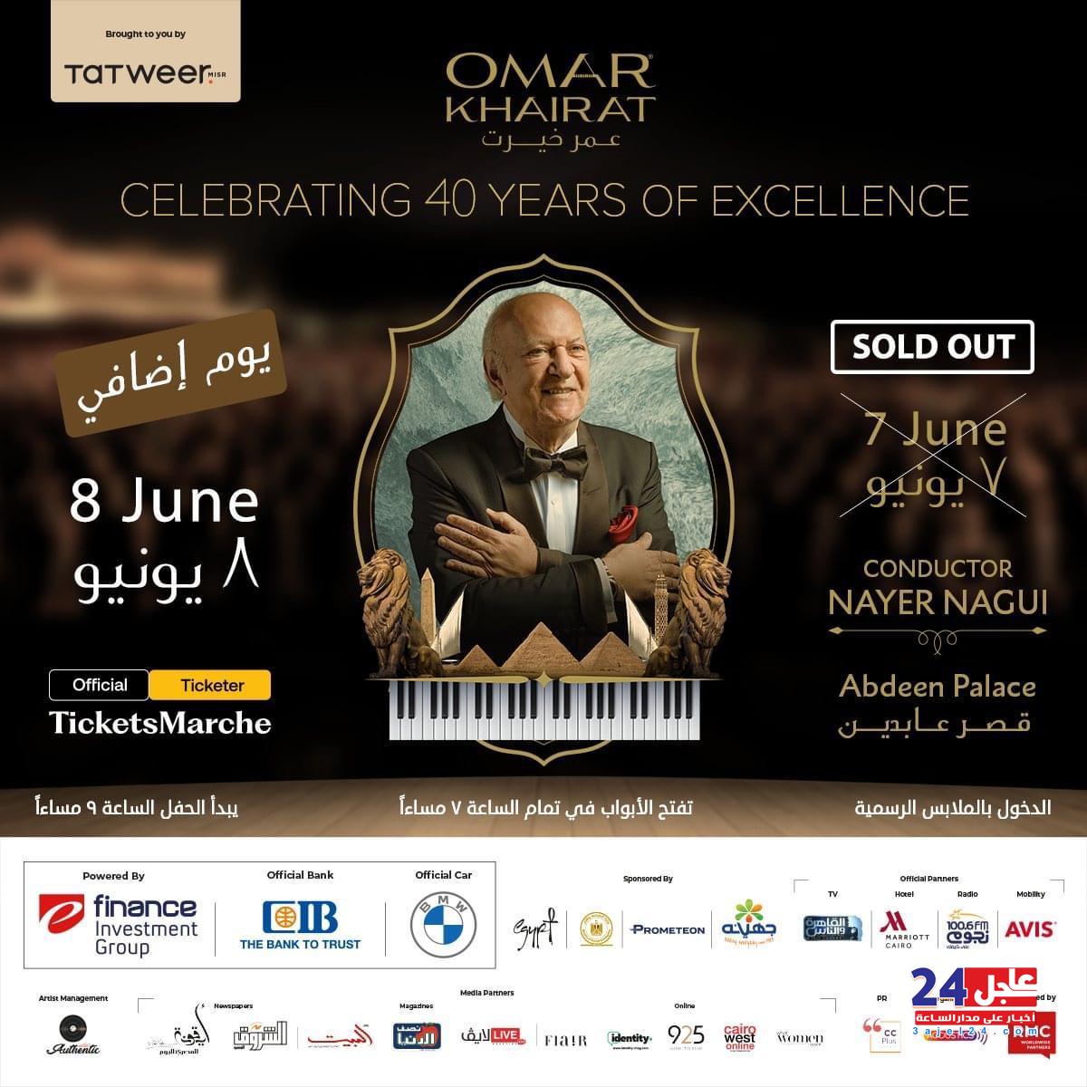 أعلنت شركة RMC للاستشارات والتسويق، المنظمة لاحتفالية الموسيقار الكبير عمر خيرت، تحت عنوان “40 سنة عمر خيرت”، إحياء حفل ضخم إضافي بناء على طلب الجمهور، بقصر عابدين التاريخي، وذلك نظرا لنفاد تذاكر حفله المقرر إقامته يوم الجمعة الموافق 7 يونيو، تكريمًا لمشواره الفني العريق، واحتفالًا بمسيرته الطويلة وعطائه الفني والموسيقى لمصر والوطن العربى، وذلك تحت رعاية كلًا من وزارة السياحة والآثار المصرية، والهيئة المصرية العامة للتنشيط السياحي.