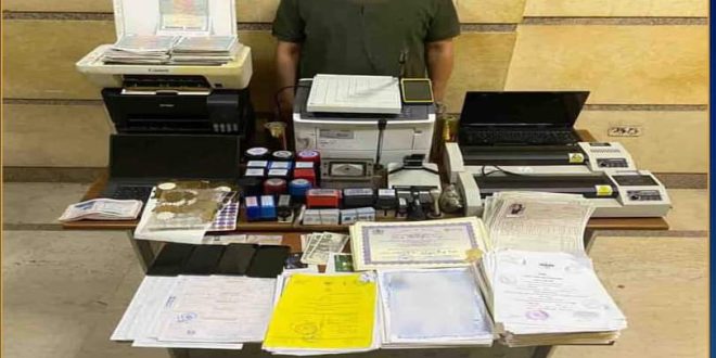 عقب تقنين الإجراءات أمكن ضبطه وبحوزته (عدد من الأختام والأكلاشيهات منسوب صدورها لعدد من الجهات – الأدوات والأجهزة المستخدمة فى التزوير – عدد من الشهادات والمستندات المزورة والمعدة للتزوير – عدد من الأوراق والمصدرات الخاصة بعملائه – عدد 4 هواتف محمولة – 2 فيزا كارت).