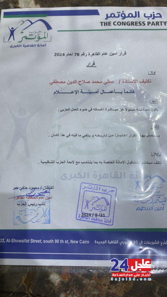 اصدر الربان محمود حنفى جبر نائب رئيس حزب المرتمر قرارا بتعين الاعلامية” سالي صلاح ” اميناً للإعلام بحزب المؤتمر امانه القاهره الكبري .