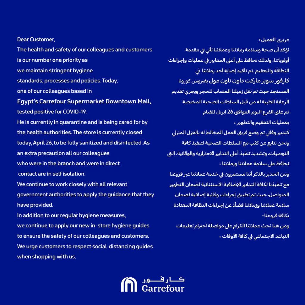وقال كارفور فى بيان لها عبر صفحتها على “فيس بوك”، تأكيد إصابة أحد الموظفين ونقله للحجر الصحى وتقديم الرعاية الطبية له من قبل السلطات الصحية المختصة، مشيرة إلى غلق الفرع اليوم للقيام بعمليات التعقيم والتطهير “.