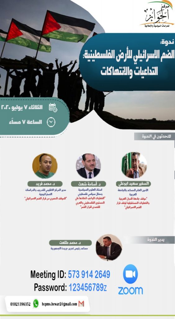 يعقد مركز الحوار للدراسات السياسية والإعلامية ندوة بعنوان “الضم الإسرائيلي للأرض الفلسطينية: التداعيات والانتهاكات”، وذلك في السابعة مساء الثلاثاء الموافق 7 يوليو 2020 وذلك عبر تقنية زووم .
