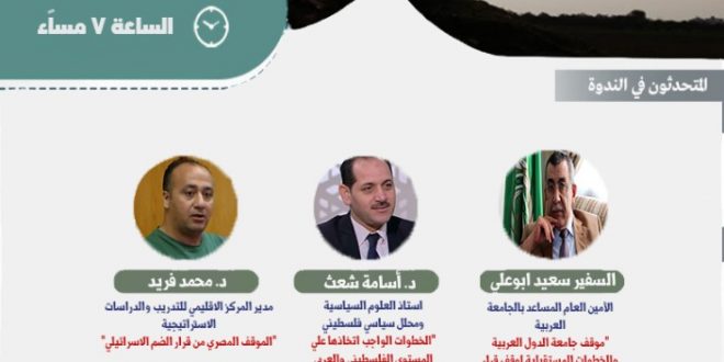 يتحدث في الندوة السفير الدكتور “سعيد أبو علي” الأمين العام المساعد في جامعة الدول العربية، والدكتور أسامة شعث المحلل السياسي الفلسطيني، والدكتور محمد فريد مدير المركز الإقليمي للتدريب والدراسات الاستراتيجية، ويدير الندوة الدكتور محمد طلعت مساعد رئيس تحرير جريدة الجمهورية .