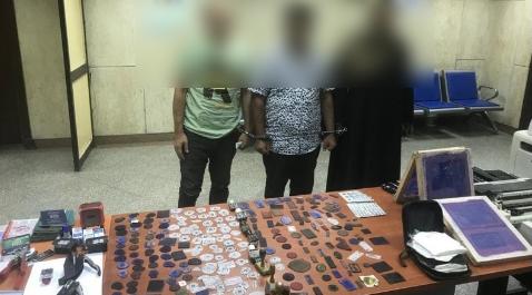 عقب تقنين الإجراءات بالتنسيق مع قطاع الأمن العام ومديريتى أمن القاهرة والجيزة تم إستهدافهم وأمكن ضبط 4 من المتهمين بمحل إقامتهم ، وعُثر بداخل مساكن المتهمين على (66 خاتم لشعار الجمهورية المنسوبة لجهات حكومية مختلفة “مقلدة” – 66 ورق “كلك” يحمل بصمات لأختام شعار الجمهورية المنسوبة لجهات حكومية مختلفة “مقلدة” – جهاز حاسب آلى بمشتملاته – 3 شابلونة أختام – 2 ماسح ضوئى “إسكانر” – ماكينة طباعة كارنيهات – 2 ماكينة قطع وتغليف كارنيهات – ماكينة تخريم ضغط – 101 أكلاشيه مختلفة منسوبة للعديد من الجهات – كمية كبيرة من الأوراق المصطنعة – مبلغ 9 آلاف جنيه)، وبمواجهتهم إعترفوا بإرتكابهم (3) وقائع بذات الأسلوب، أبرزها قيام أحد المتهمين بإستخراج بطاقة رقم قومى منتحلاً بيانات (أحد الأشخاص – يعمل بالخارج) دون علمه والشروع فى إستخدامها، بمحاولة الإستيلاء على مبلغ 10 مليون جنيه من حسابه بأحد البنوك عن طريق إجراء تحويلان (الأول بمبلغ 8 مليون جنيه لصالح أحد المتهمين – الثانى بمبلغ 2 مليون جنيه لصالح إحدى السيدات “جارى فحص موقفها”).