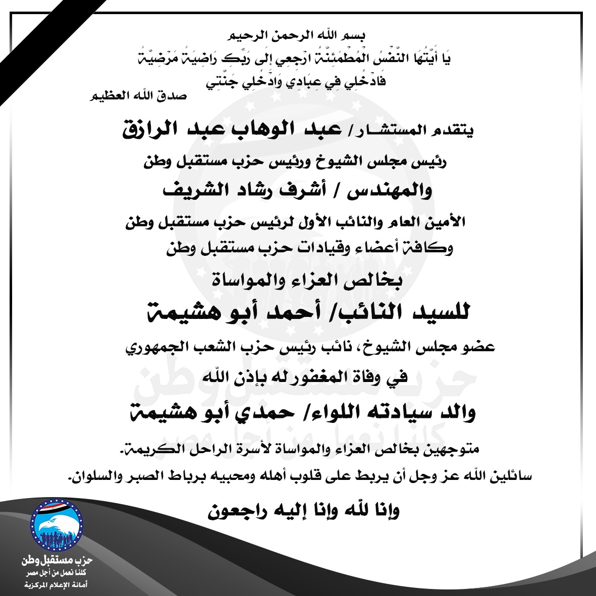 بخالص العزاء والمواساة للسيد النائب/ أحمد أبو هشيمة عضو مجلس الشيوخ، نائب رئيس حزب الشعب الجمهوري