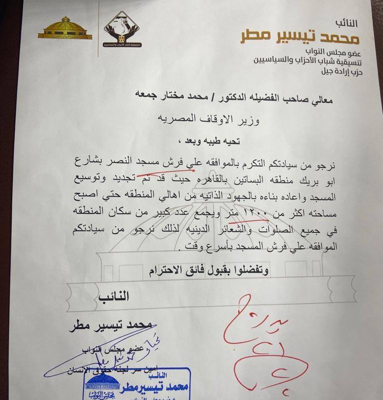 تمكن النائب محمد تيسير مطر، الأمين العام لحزب إرادة جيل وعضو تنسيقية شباب الأحزاب والسياسيين، من الحصول على موافقة الدكتور محمد مختار جمعة، وزير الأوقاف المصري، على فرش مسجد النصر بشارع أبو بريك بمنطقة البساتين بالقاهرة، عقب الانتهاء من توسعته بالجهود الذاتية.