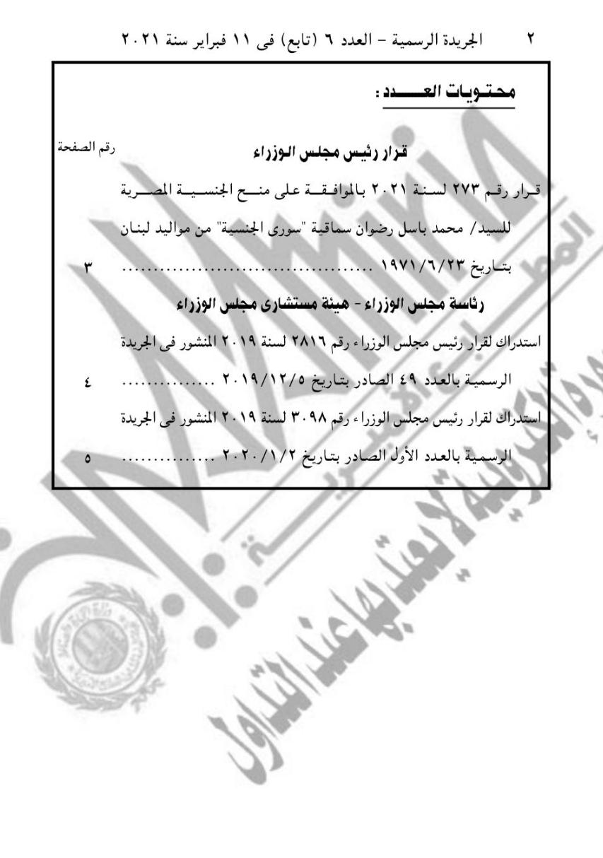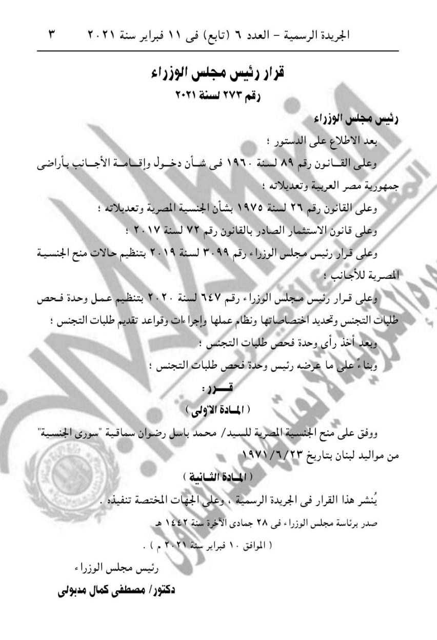 ونشرت الجريدة الرسمية القرار رقم 273 لسنة 2021، الذى تضمن بمنح الجنسية المصرية لمحمد باسل رضوان سماقية سورى الجنسية من مواليد 23 يونيو 1971.