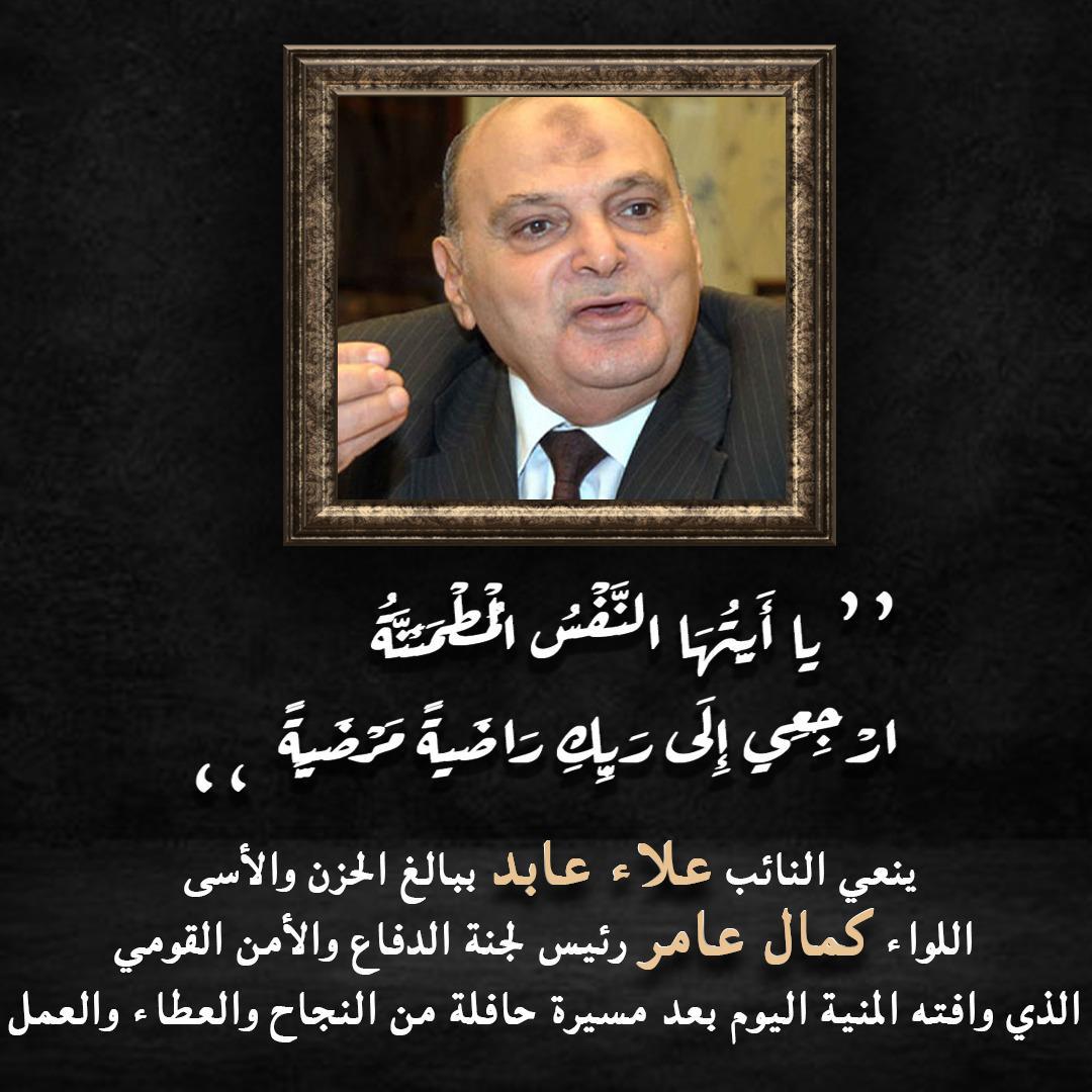 وقال عابد. ببالغ الحزن والأسى انعي سيادة اللواء كمال عامر رئيس لجنة الدفاع والأمن القومي بمجلس النواب الذي وافته المنية اليوم الخميس بعد مسيرة حافلة من النجاح والعطاء في العمل داعين المولى عز وجل أن يتغمده بواسع رحمته ويسكنه فسيح جناته ويلهم أهله الصبر والسلوان