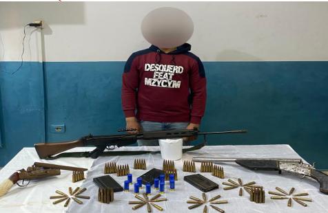 عقب تقنین الإجراءات أمكن ضبطه بمسكنه وبحوزته (بندقیة آلیة – بندقیة خرطوش – فرد خرطوش – عدد 3 خزینة – كمیة من الطلقات مختلفة الأعیرة).