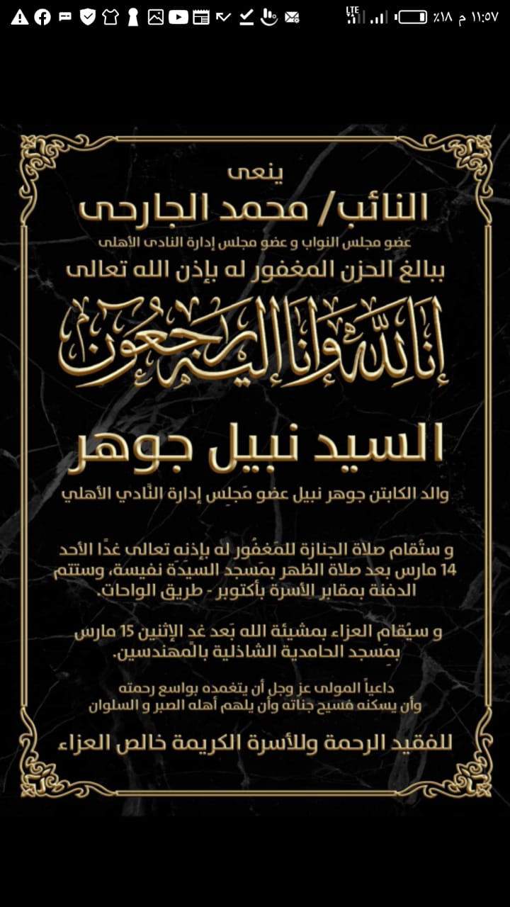 نعي النائب البرلماني محمد الجارحي عضو مجلس النواب -عضو مجلس إدارة النادي الأهلي وفاة والد نبيل جوهر عضو مجلس إدارة النادي الأهلي والذي توفي اليوم السبت بعد صراع مع المرض