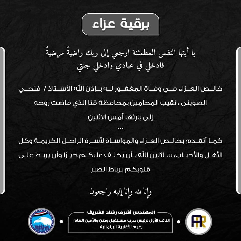 نعي المهندس أشرف رشاد الشريف زعيم الأغلبية البرلمانية بمجلس النواب الأمين العام لحزب مستقبل وطن وفاة فتحي الصويني نقيب المحامين بمحافظة قنا