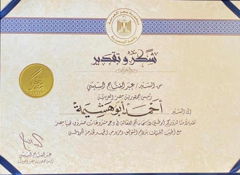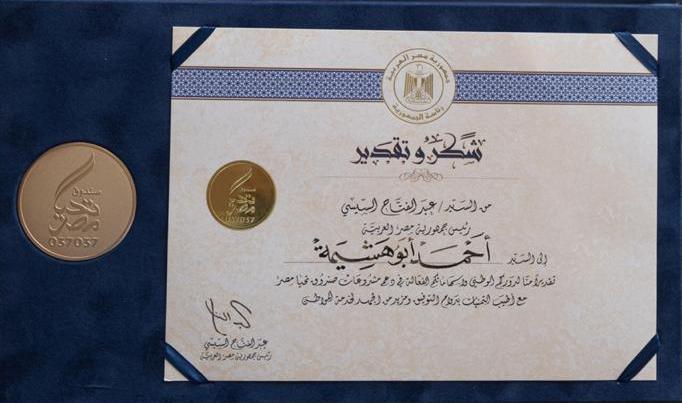 وكان الرئيس السيسي قامه بتكريم النائب ورجل الأعمال احمد ابو هشيمة تقديراً لدوره الفعال في دعم أنشطة صندوق تحيا مصر.