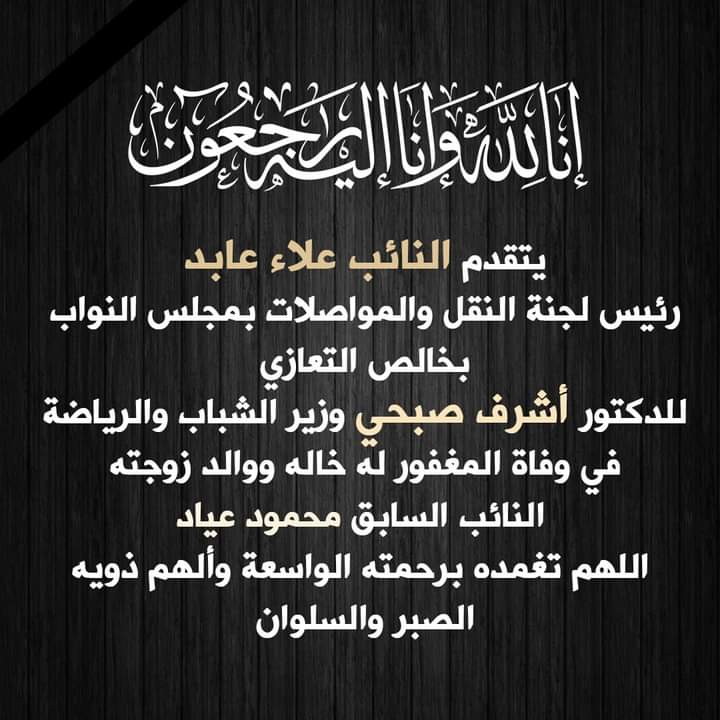 نعي النائب البرلماني علاء عابد رئيس لجنة النقل والمواصلات بمجلس النوابو وفاةالنائب السابق محمود عياد والد زوجته الدكتور أشرف صبحي وزير الشباب والرياضة