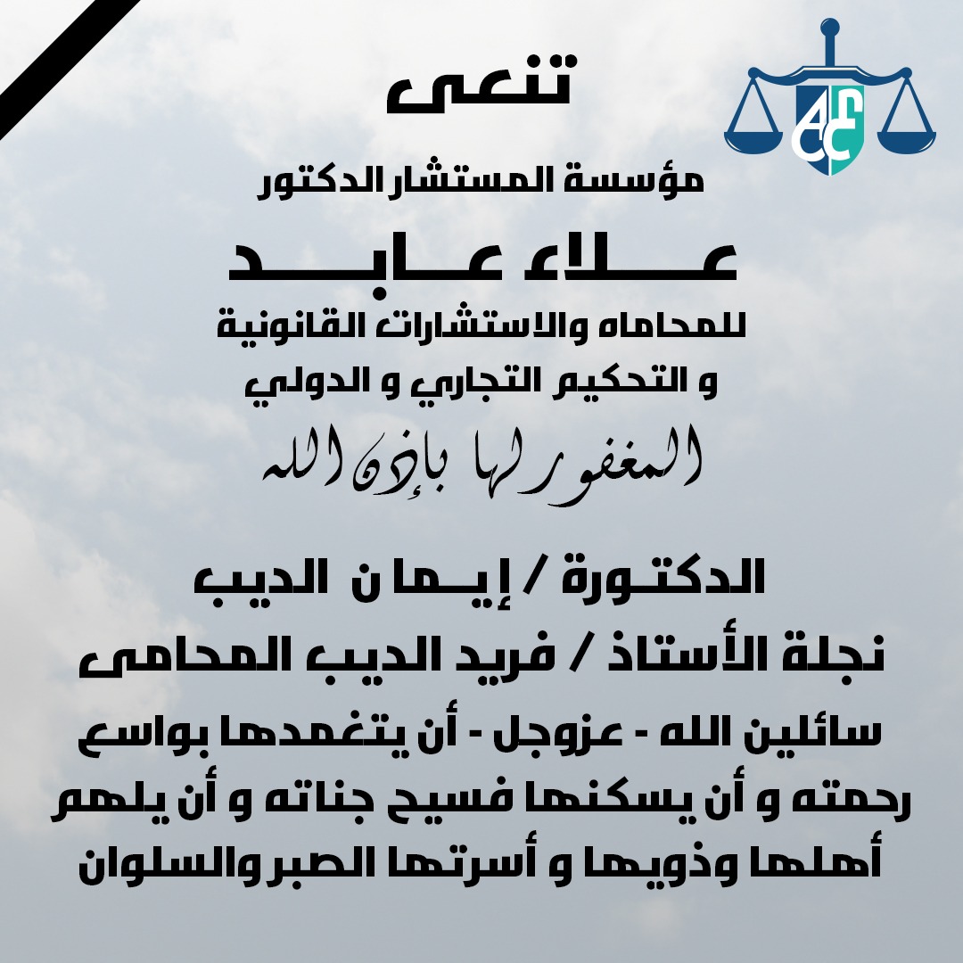 تنعي مؤسسة المستشار علاء عابد للمحاماه برئاسة النائب علاء عابد رئيس لجنة النقل بمجلس النواب – نائب رئيس البرلمان العربي – نائب رئيس حزب مستقبل وطن .. المحامي الكبير فريد الديب في وفاة ابنته الدكتورة إيمان الديب أستاذ القانون الدولى بكلية الحقوق جامعة القاهرة والذي توفت اليوم الأربعاء متأثرة بفيروس كورونا