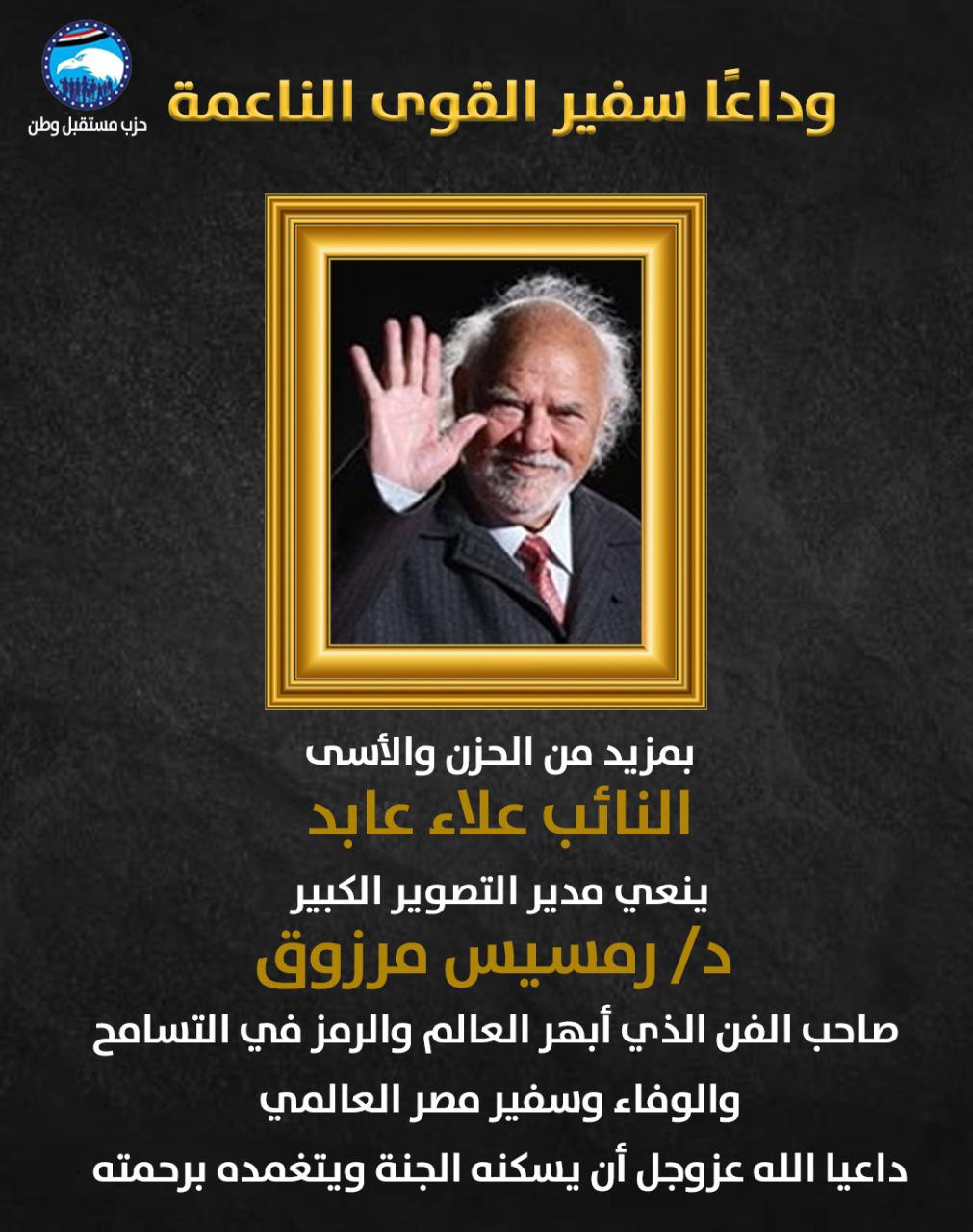 نعي النائب البرلماني علاء عابد رئيس لجنة النقل والمواصلات بمجلس النواب – رئيس لجنة مكافحة الأرهاب بالبرلمان العربي نائب رئيس حزب مستقبل وطن : الدكتور رمسيس مرزوق مدير التصوير السينمائي الذي توفي أمس الجمعة عن عمر يناهز 81 عاماً