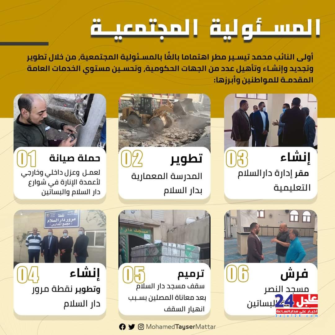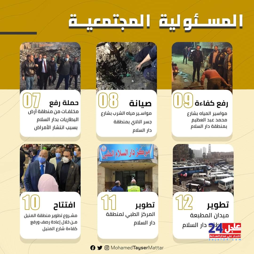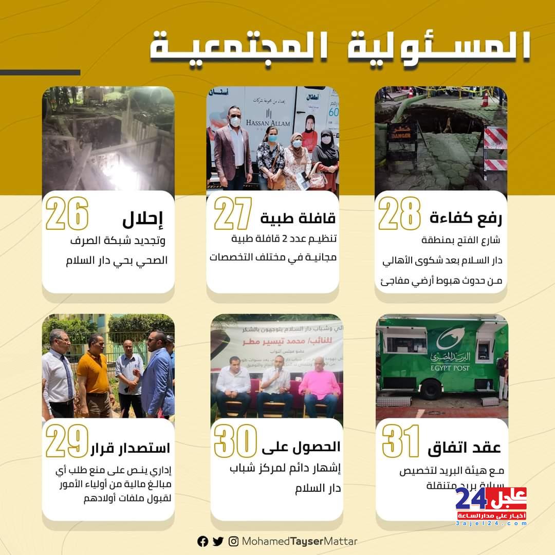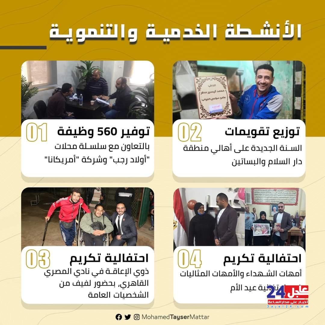 عندما ترشح النائب محمد تيسير مطر لعضوية مجلس النواب عن تنسيقية شباب الأحزاب والسياسيين، كان قد طرح نفسه من خلال برنامج سياسي يهدف في المقام الأول إلى وضع آلية تواصل بينه وبين المواطن، سعيًا لتغيير مفهوم المواطن عن “المسئول الخفي” الذي يظهر فقط في المواسم الانتخابية، وهذا ما حققه عقب نجاحه، بتأسيس عدة مكاتب لخدمة المواطنين، يعمل بها مجموعة من خيرة شباب محافظة القاهرة، وذلك لتلقي شكاوى المواطنين، ووصل عدد الشكاوى التي استقبلها المكتب لأكثر من ٣٣٠٠ شكوى وطلب، تم العمل عليها بالشكل اللائق، وفق قواعد منظومة الشكاوى.