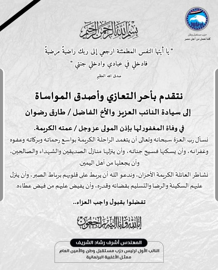 نعي المهندس أشرف رشاد الشريف زعيم الأغلبية البرلمانية بمجلس النواب النائب الأول لرئيس حزب مستقبل وطن الحاجة ثريا عبد الحميد رضوان