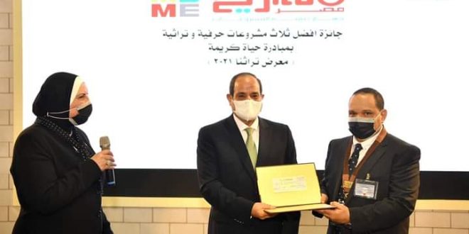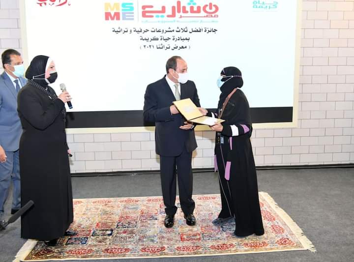 سلم قبل قليل الرئيس عبد الفتاح السيسي اليوم السبت جوائز مالية لأفضل ثلاثة مشروعات حرفية وتراثية للقرى على مستوى الجمهورية، على هامش افتتاحه، اليوم السبت، فعاليات معرض (تراثنا) للحرف اليدوية، المقام حتى 15 أكتوبر، في مركز مصر للمعارض الدولية بالتجمع الخامس