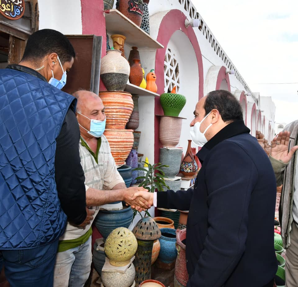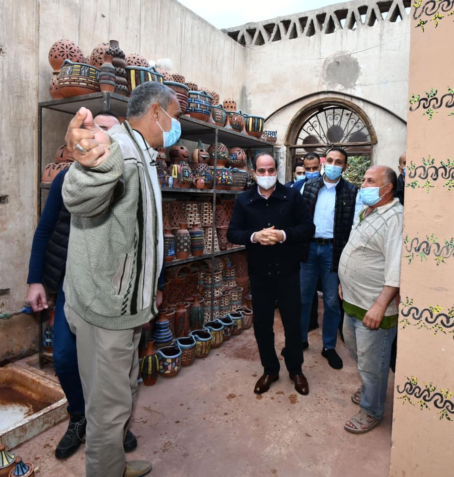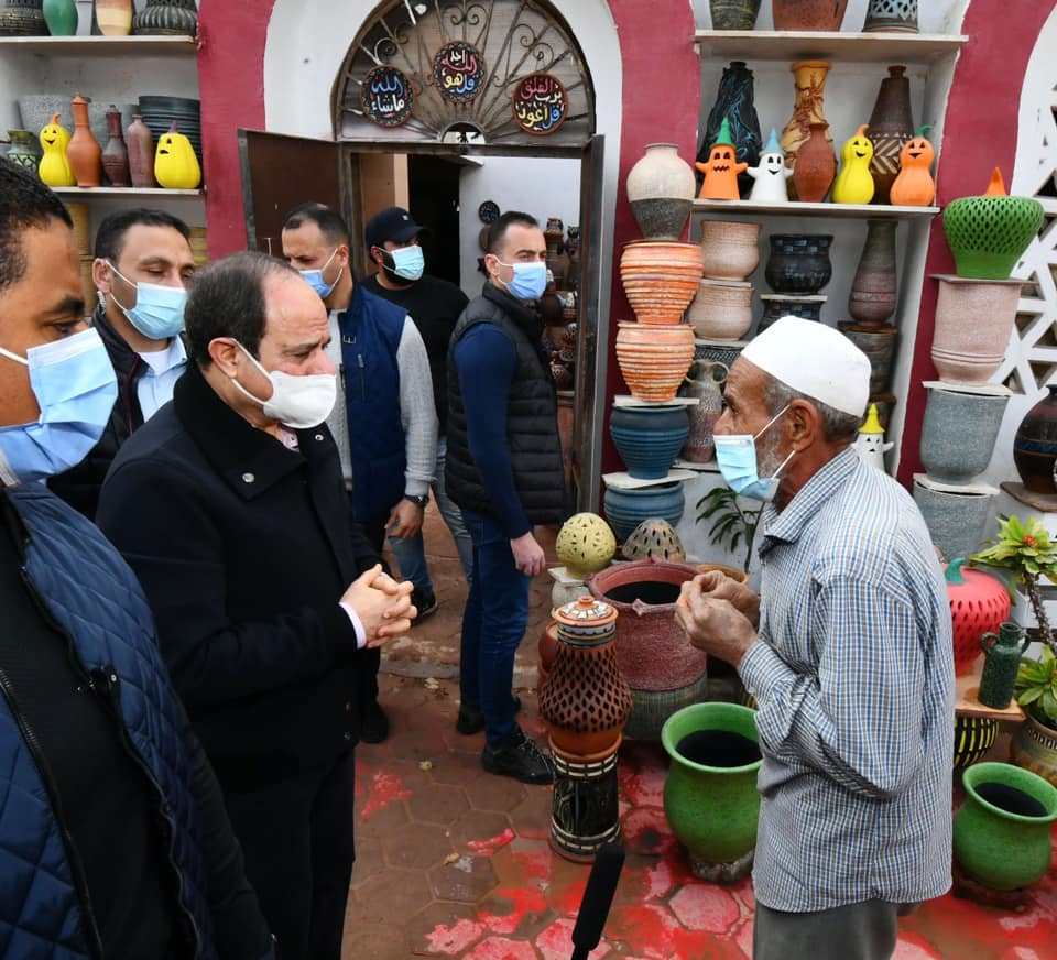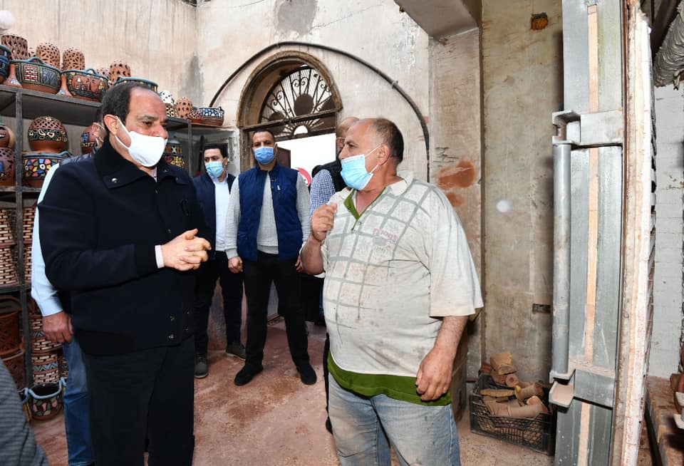 وخلال الجولة، تبادل الرئيس السيسي، التحية مع المواطنين والعاملين في ورش الفخار بمصر القديمة، واستمع خلالها إلى طلباتهم واحتياجاتهم.