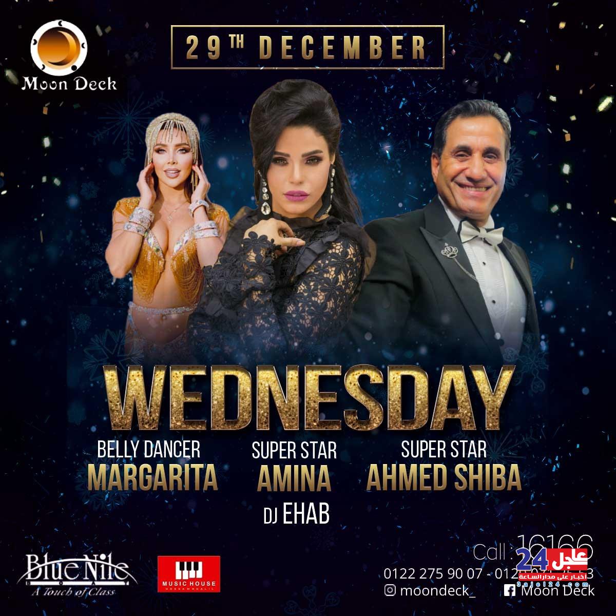 يستعد كل من النجم أحمد شيبة والمطربة أمينة والراقصة الاستعراضية مارجريتا لإحياء أولى حفلات رأس السنة وذلك مساء اليوم الأربعاء في “المون ديك” بالباخرة blue Nile بمنطقة الزمالك .