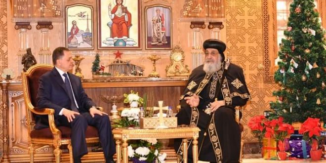 هنأ اللواء محمود توفيق وزير الداخلية البابا تواضروس الثاني بابا الإسكندرية بطريرك الكرازة المرقسية بالعباسية بمناسبة عيد الميلاد المجيد
