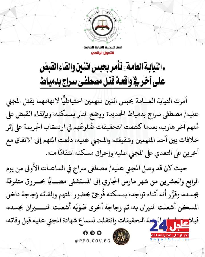 أصدر منذ قليل النائب العام المستشار حمادة الصاوي قرارا بحبس اثنين متهمين احتياطيا لاتهامهما بقتل المجنى عليه مصطفى سراج بدمياط الجديدة ووضع النار بمسكنه، وبإلقاء القبض على متهم آخر هارب