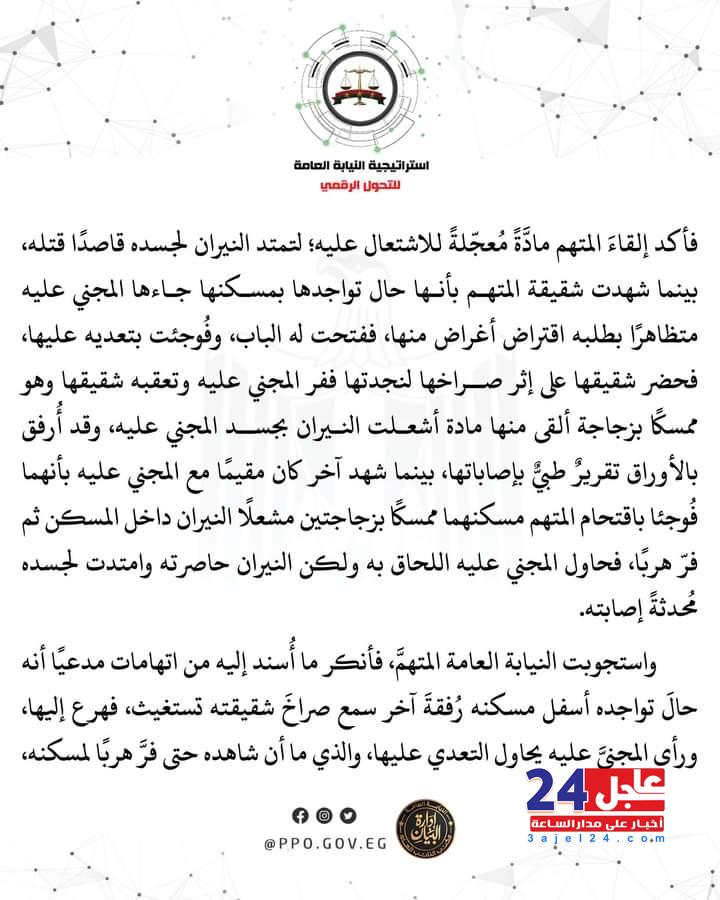 وكان المجنى عليه مصطفى سراج قد وصل فى الساعات الأولى من يوم الرابع والعشرين من شهر مارس الجارى إلى المستشفى مصابا بحروق متفرقة بجسده، وقرر أنه خلال تواجده بمسكنه فوجئ بحضور المتهم وإلقائه زجاجة داخل المسكن أشعلت النيران به، ثم زجاجة أخرى صوبه أشعلت النيران بجسده.