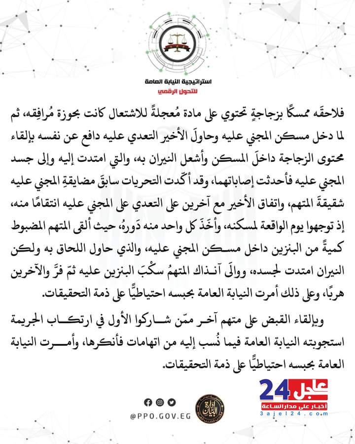 يأتى ذلك بعدما كشفت التحقيقات ضلوعهم فى ارتكاب الجريمة على إثر خلافات بين أحد المتهمين وشقيقته والمجنى عليه، دفعت المتهم إلى للااتفاق مع آخرين على التعدى على المجنى عليه وإحراق مسكنه انتقاما منه