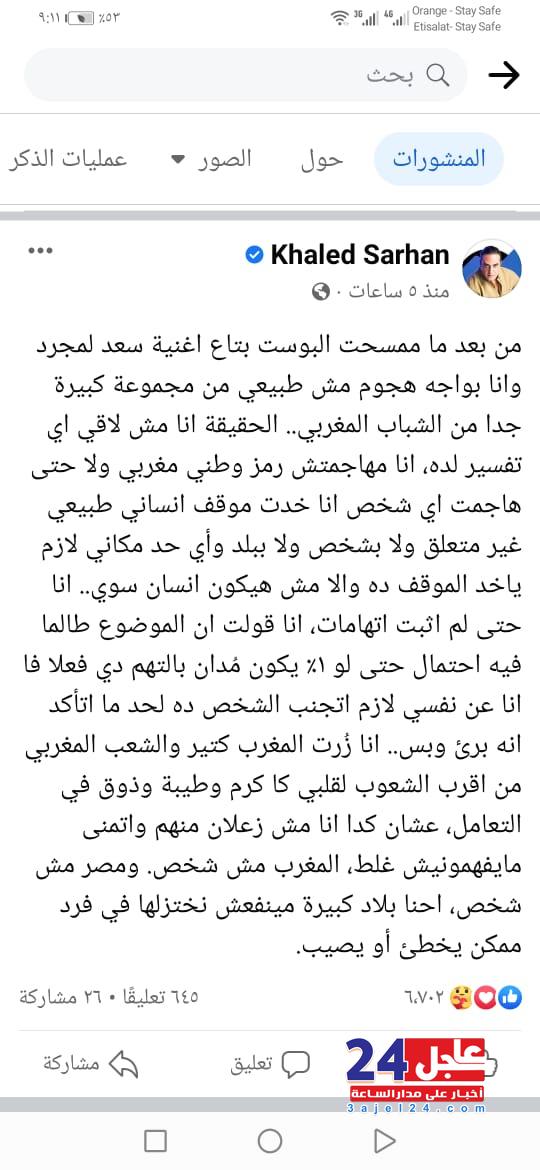وأتى اعتذار خالد سرحان بعد معرفته أن الفنان المغربي سعد المجرد يشارك في الأغنية “أول دقيقة” الموجودة في الفيديو الذي نشره منذ أيام عبر حسابه الخاص، فهو حسب ما أوضح، لا يقبل أن يساهم في إبراز شخص متهم بقضية إغتصاب، ولم تظهر براءته حتى الآن.وقال خالد سرحان في رسالة إعتذاره: “تنويه سريع. في اغنية انا اتريقت عليها في فيديو عندي على الصفحة امبارح.. الاغنية دي كانت تريند على تيك توك وانا بكل امانة مش مميز غير صوت اليسا في الاغنية ومعرفش مين اللي بيغني معاها.. فا صديق ليا كلمني وبالصدفة بيقولي شفت الفيديو بتاعك على اغنية سعد لمجرد قفلت معاه ومسحت البوست في ساعتها.انا الشخص ده ماكنتش اعرفه اصلا غير لما مره من كام سنة اتصور معايا في فرنسا وبعدها اصدقائي قالولي ان ده مغني واسمه سعد لمجرد، عشان كدا حابب اعتذر لمتابعيني وجمهوري اني ساهمت في ابراز شخص متهم بالاغتصاب في أكتر من دولة وبـ بنات كتير.. انا مش بهاجم ولا حتى بتهم بس عالاقل مش هتسامح مع شخص متهم بإتهامات لا تغفر زي دي ولسا لم تثبت براءته لحد دلوقتي. بعتذرلكم تاني”.