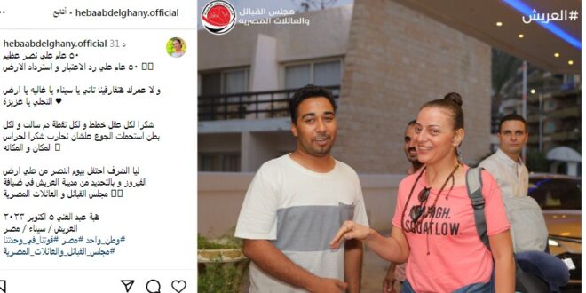ونشرت هبة عبد الغني عبر حسابها الرسمي بموقع تبادل الصور والفيديوهات الشهير”انستجرام”، صورة لها من لحظة وصولها العريش، وعلقت على الصورة، قائلة :”٥٠ عام علي نصر عظيم ، ٥٠ عام علي رد الاعتبار و استرداد الأرض، و لا عمرك هتفارقينا تاني يا سيناء يا غاليه يا ارض التجلي يا عزيزة”.