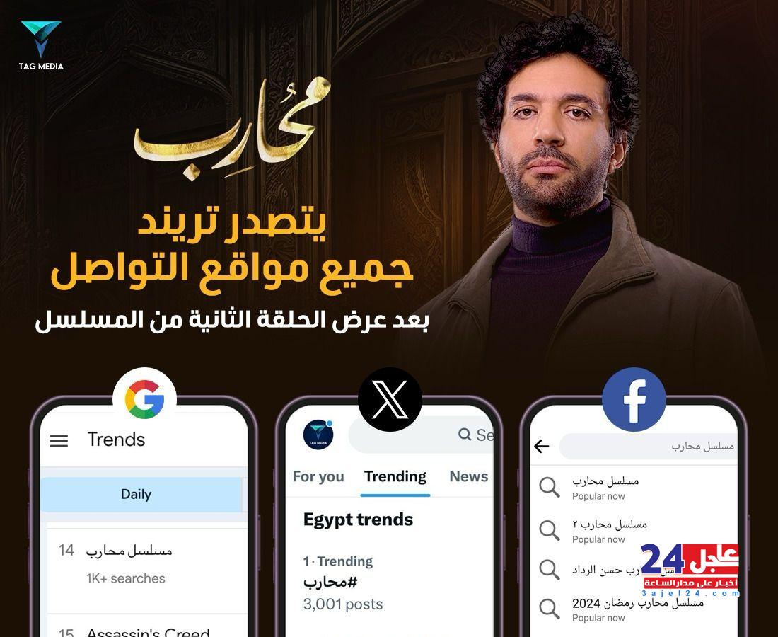 يتصدر مسلسل محارب التريند الاول علي جميع مواقع التواصل الاجتماعي وذلك عقب انتهاء الحلقة التانية من مسلسل محارب والتي شهدت تصاعد في الاحداث وبدايه الصراع بين محارب وعزازي الذي يجسده ماجد المصري ومحاميه حسام الجيوشي .