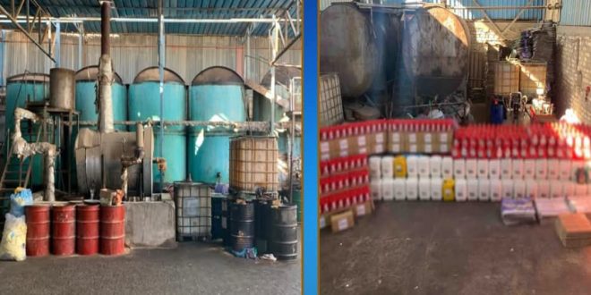 أكدت معلومات وتحريات اللواء وليد بدر مدير مباحث الإدارة العامة لشرطة البيئة والمسطحات قيام مالك مصنع بدون تراخيص له معلومات جنائية كائن بدائرة مركز شرطة بلبيس بمديرية أمن الشرقية بتجميع زيوت محركات السيارات المرتجعة المتهالكة والسابق إستخدامها وإعادة تدويرها وتعبئتها داخل عبوات بلاستيكية جديدة منسوب إنتاجها لشركات وهمية لطرحها بالأسواق لتحقيق أرباح مادية غير مشروعة من الغش والتدليس عقب تقنين الإجراءات تم إستهداف المصنع بقيادة العميد محمد أنور فهمي رئيس مباحث المسطحات المائية وتم ضبط مالك المصنع والمدير المسئول وعثر بداخل المصنع على (78,5 طن نفايات بترولية خطرة عبارة عن زيوت محركات سيارات مستعملة – 23560 لتر منتج نهائى لزيوت محركات معاد تدويرها معبأة داخل عبوات بلاستيكية جديدة ومنسوب إنتاجها لشركات وهمية بإستخدام علامات تجارية غير مسجلة – خط إنتاج كامل وبواجهتهما إعترفا بإرتكابهما الواقعة على النحو المشار إليه.