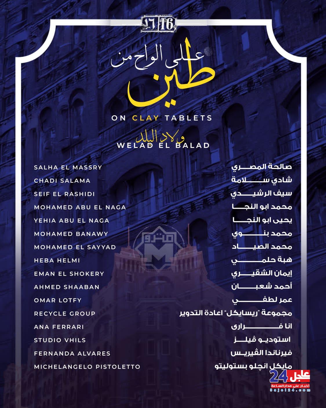 ● علي الواح من طين : مستوحى من تطور الإنسانية من الحكايات الشفوية إلى الذاكرة المكتوبة، محوِّلاً الأصوات الزائلة إلى إرث حضاري دائم. يشارك فيه الفنان الإيطالي الأسطوري ميكيلانجيلو بيستوليتو، أحد رواد حركة “آرته بوفيرا”، إلى جانب المجموعة الفرنسية-الروسية ريسايكل غروب، والفنانة البرازيلية آنا فيراري، والفنان البرتغالي ألكسندر فارتو (فيهلس)، والمصممة الأمريكية أليكس بروبا، بالإضافة إلى عشرة فنانين مصريين.